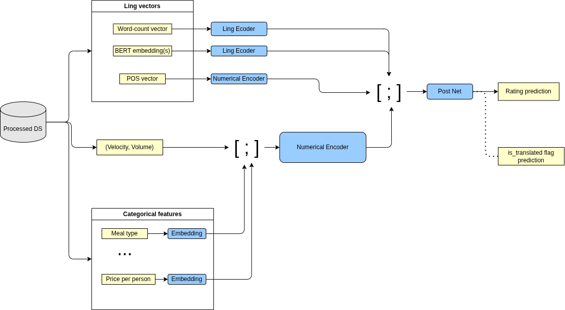 The ultimate goal of this work is to develop a neural network capable of predicting the rating of the given review. The model is designed to use a chosen subset of the data features and encode them using dedicated encoders. Depending on the nature of the input data, the model uses either Linguistic Encoders, that consist of a stack of fully-connected layers with ReLU activations, normalization and dropout, or Numerical Encoders, that leverage Kolmogorov-Arnold networks, which take longer to train but are more expressive.