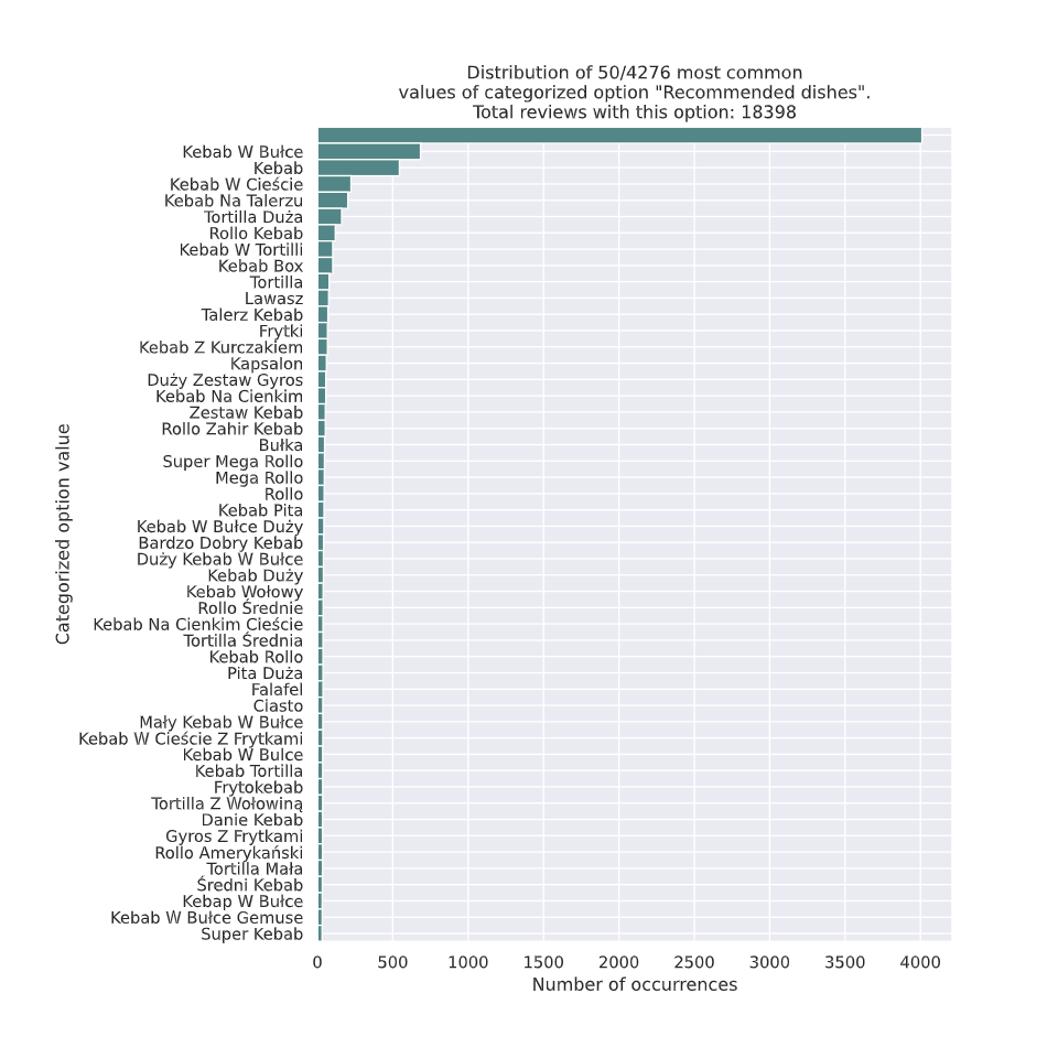 On this page, I present my analysis of textual reviews of kebab restaurants, scraped from Google Maps. I aimed to perform thorough experiments involving setting up the scraping pipeline, preprocessing the data, extracting useful numerical representations and training neural network-based models to recognize the sentiment of the reviews. Each review was converted into a set of linguistic representations, from classical ones (e.g. TF-IDF) to modern Transformer-based embeddings, and numerical features. I subsequently trained multiple configurations of neural network-based models to predict review rating on scale 1 to 5. Obtaining the results allowed me to gain meaningful insight into the data and draw conclusions on the applicability of different NLP techniques for sentiment analysis.