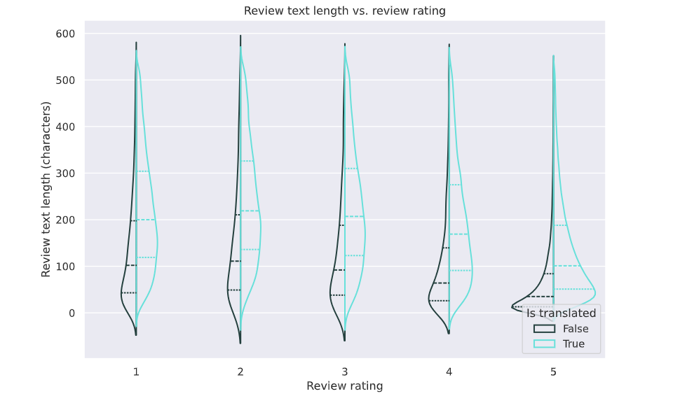 The EDA involved analysing the scraped raw data in order to understand its structure, distribution, and potential insights. The distribution of various features was examined with respect to data categories, such as whether the review was originally in English.