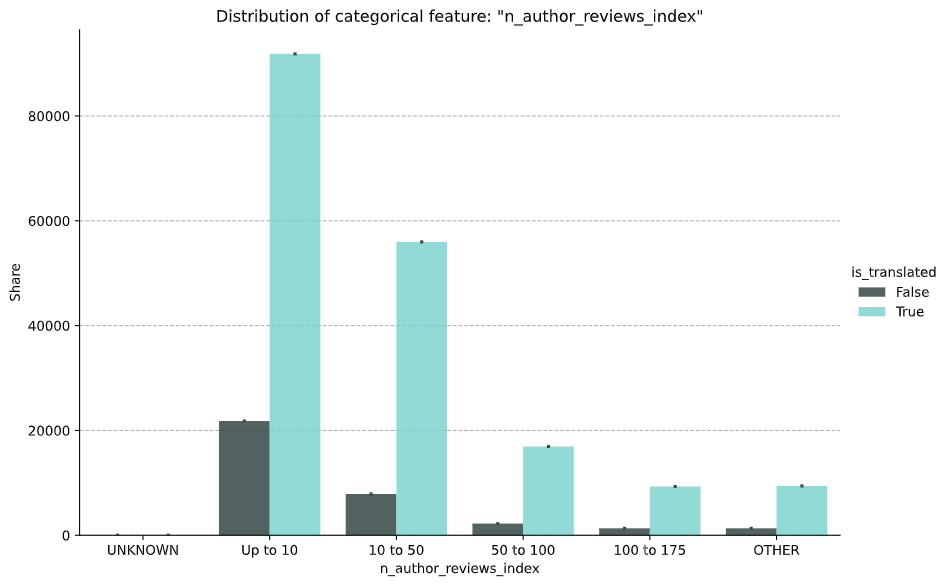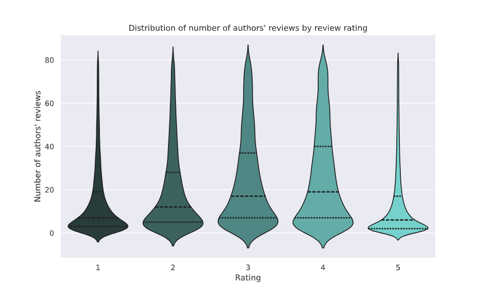 | Num. of reviews written by author (min, max, avg) | (1, 998, 38) | (1, 920, 35) |