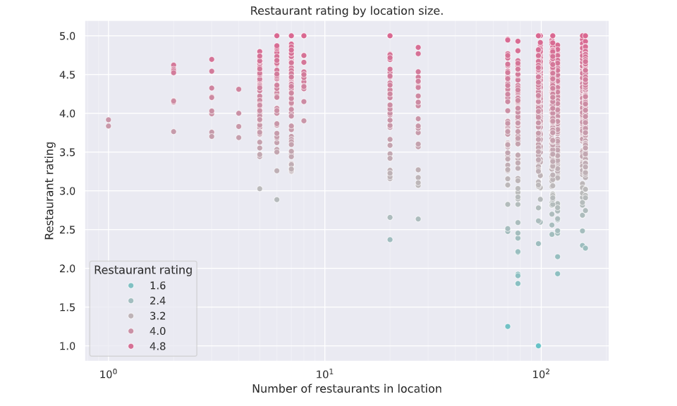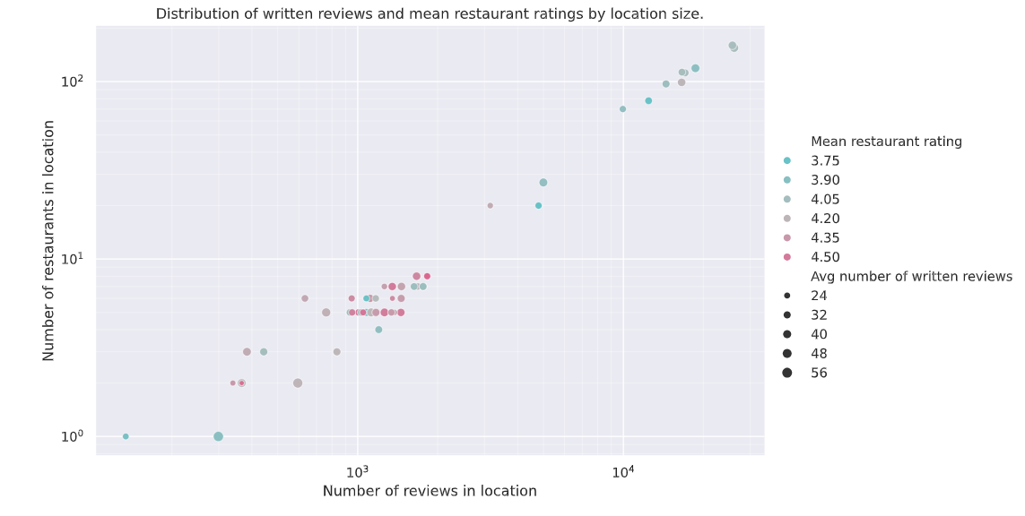 | Num. of restaurants per primary location (min, max, avg) | (1, 160, 23) | (5, 68, 36) |