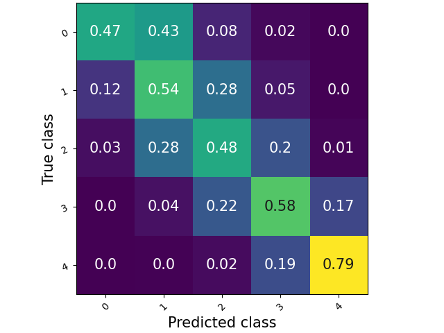Due to the imperfect nature of the reviews rating task, there's no perfect algorithm to achieve 100% accuracy, as the rating is in practice often strongly subjective. It is reflected in the level of confusion in the prediction of neighboring classes. For this reason, I focused on evaluating the model's ability to predict the coarse "bad" and "good" classes. I believe this to be a more realistic and meaningful evaluation for this type of task.