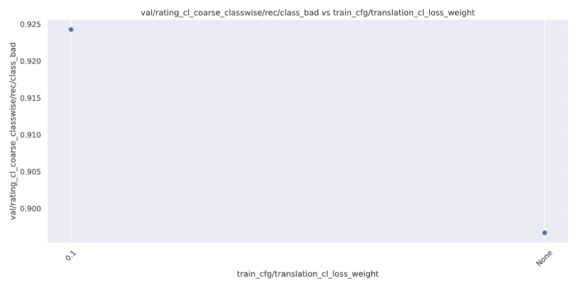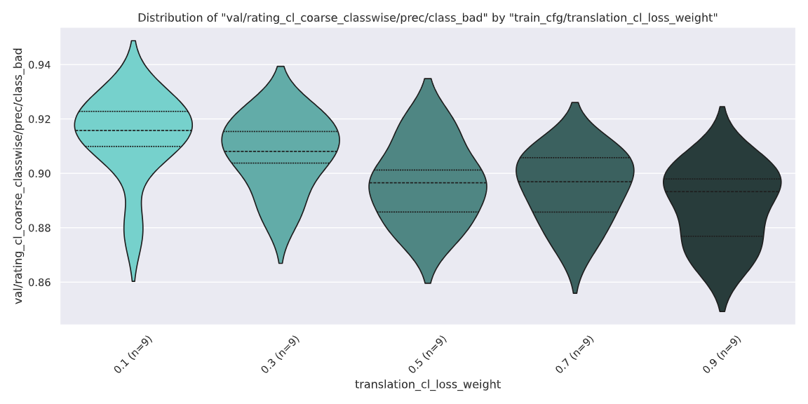 | Baseline | The best model obtained in the initial experiments. It uses the secondary task of translation flag prediction. It also includes all input categorical features and the best performing trace features. The linguistic representations include sentence-level BERT embeddings and top 7000 TFIDF vector. |