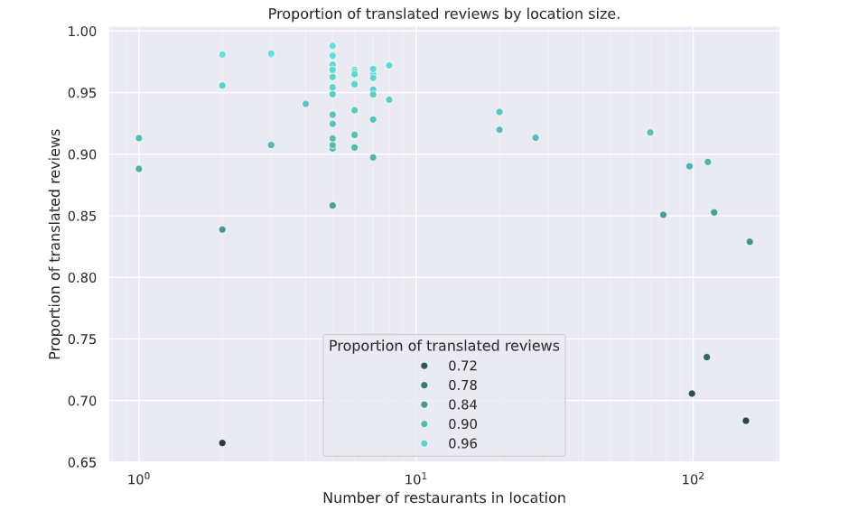 | Num. of reviews per restaurant (min, max, avg) | (1, 300, 168) | (11, 295, 158) |